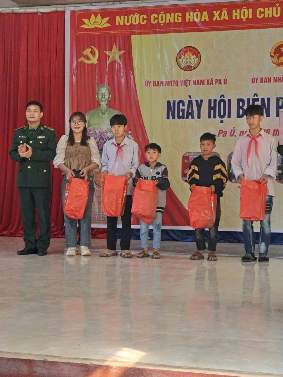 Đ/c Ngô Văn Phương-Chính trị viên đồn biên phòng Pa Ủ trao quà cho các cháu có hoàn cảnh khó khăn